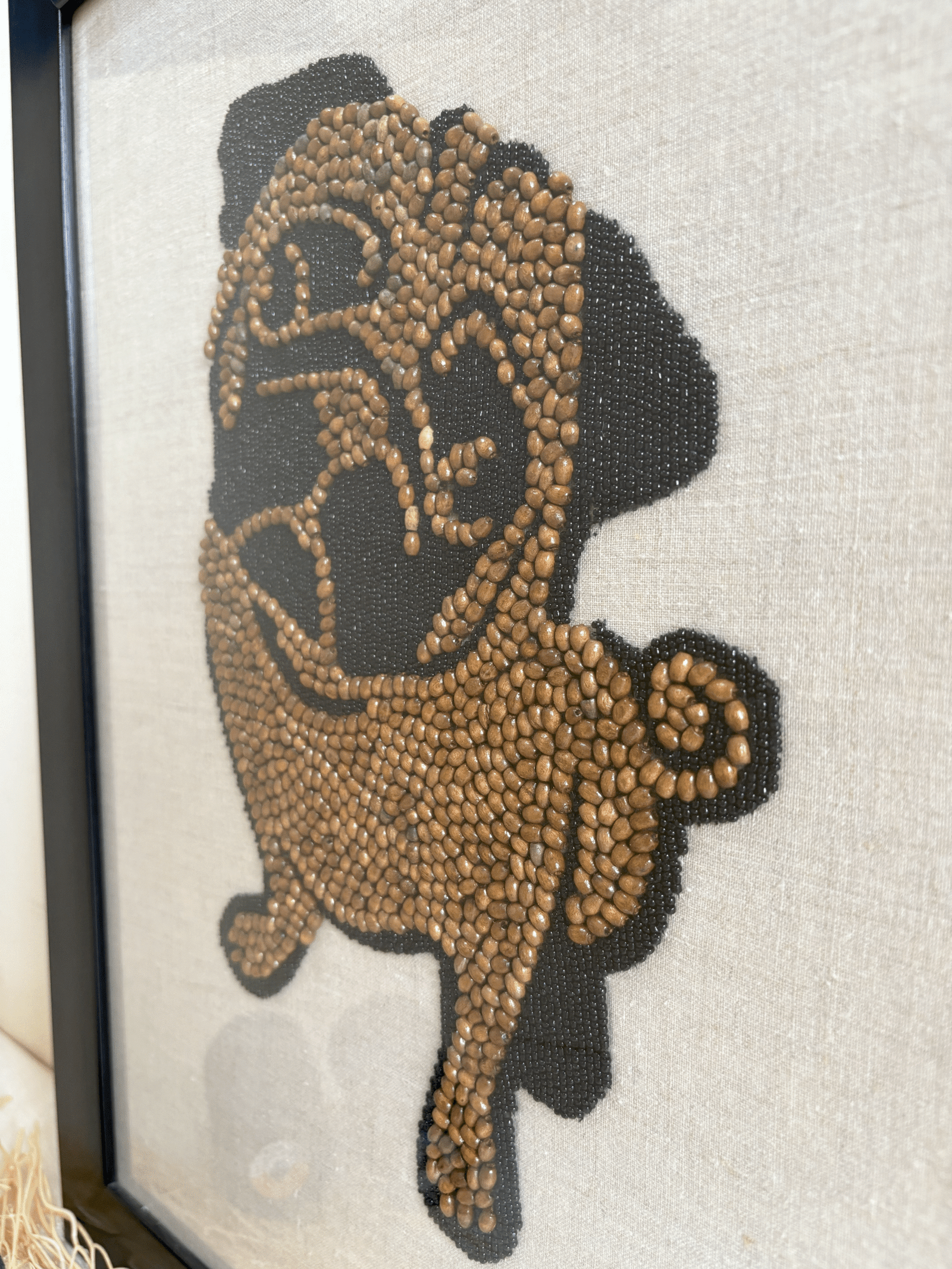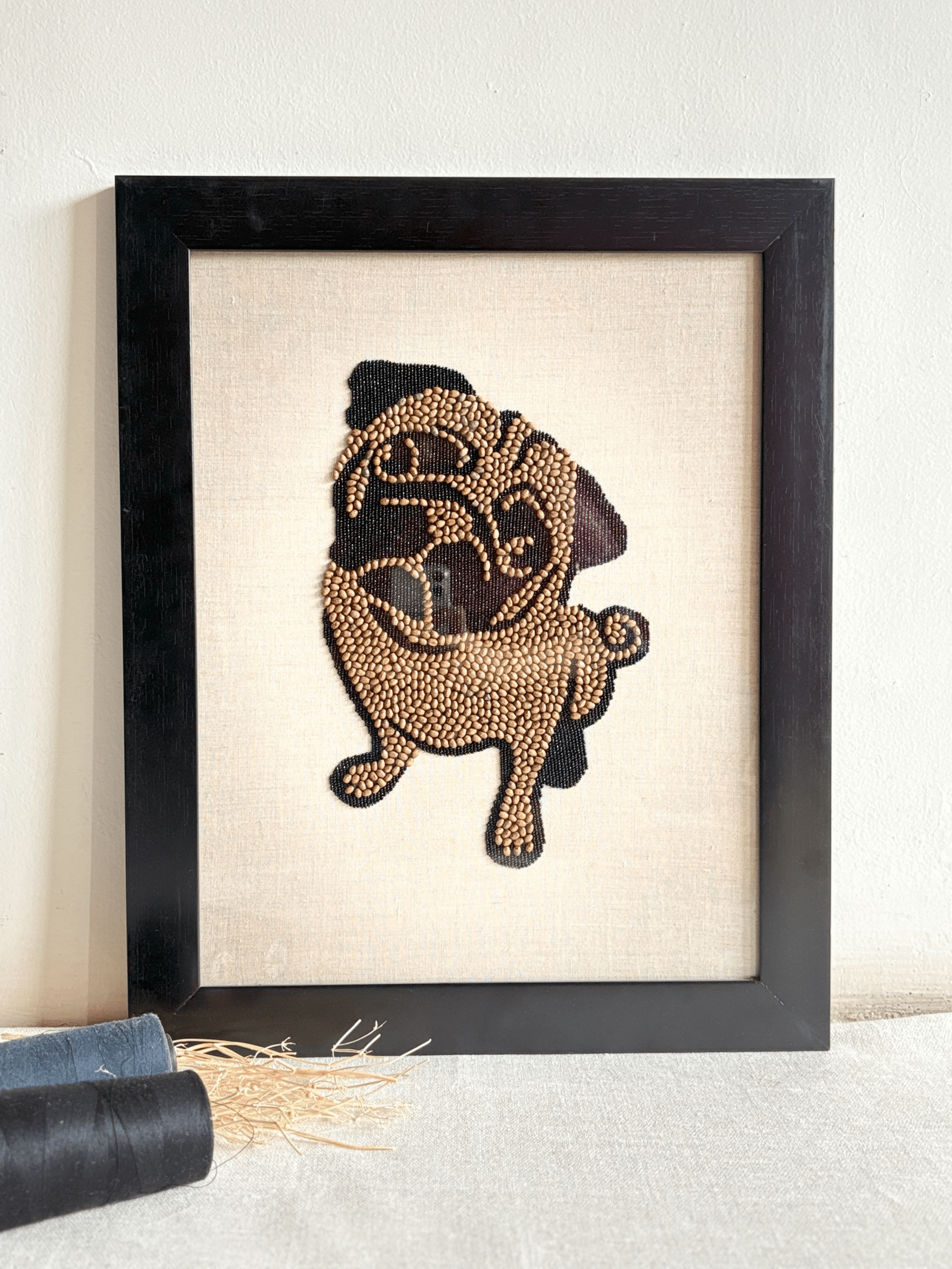 A charming pug dog, hand-embroidered with rich golden and black details, stands out against a crisp white background. Every stitch brings out the pug’s playful face and its cute, unique style. This unique handmade art piece is perfect for dog lovers and adds a fun, loving touch to any home.