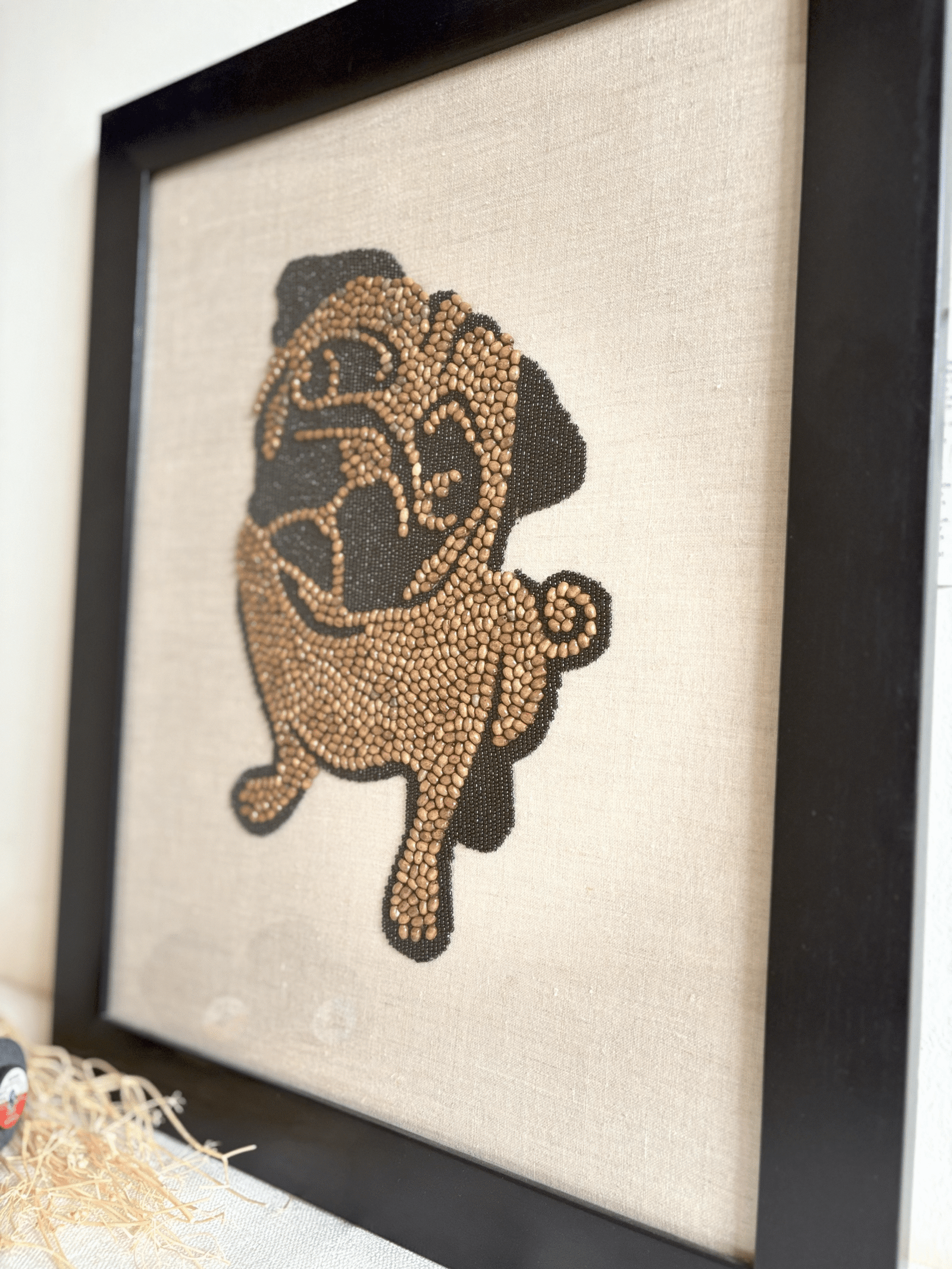 A charming pug dog, hand-embroidered with rich golden and black details, stands out against a crisp white background. Every stitch brings out the pug’s playful face and its cute, unique style. This unique handmade art piece is perfect for dog lovers and adds a fun, loving touch to any home