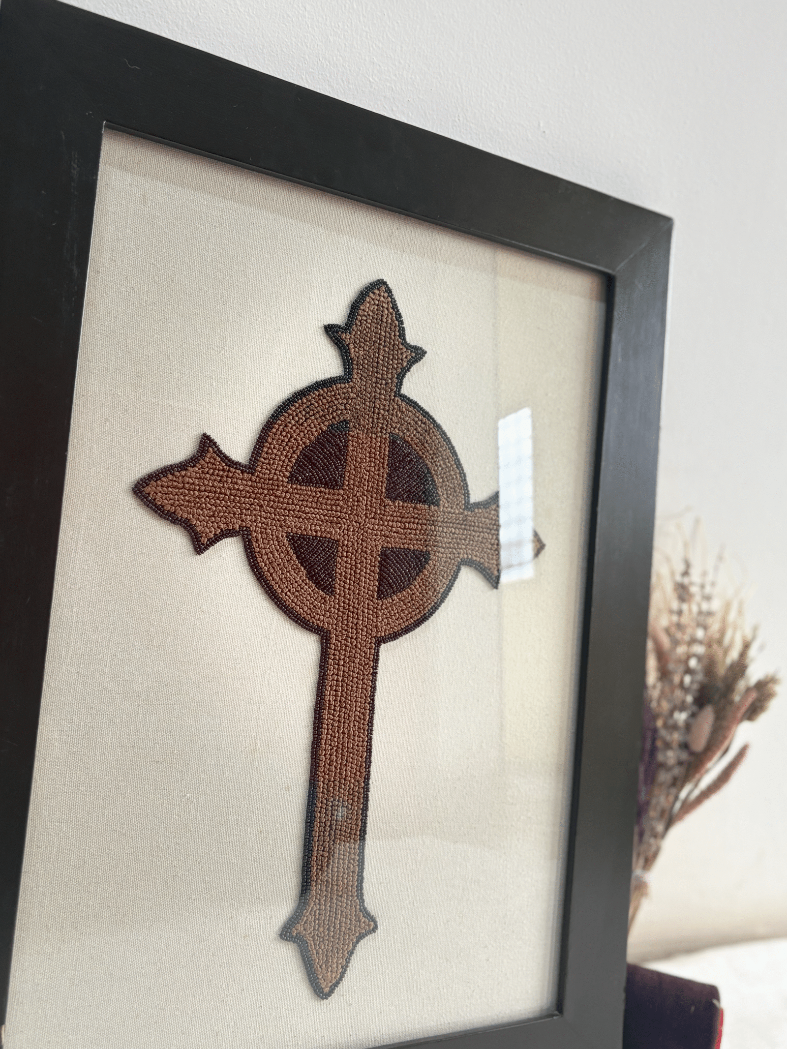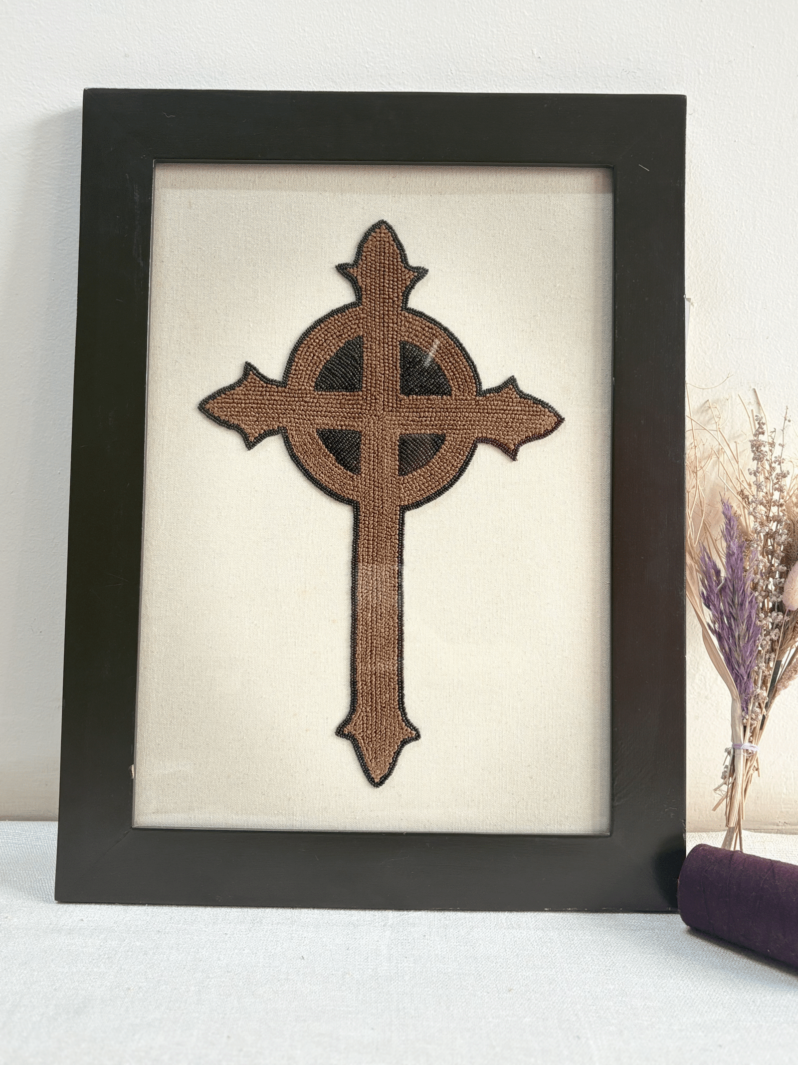 A classic Celtic cross, hand-embroidered with glass beads and rayon thread, stands strongly on a crisp white background. Every stitch shows the deep meaning of the cross and its peaceful, lasting beauty. This unique handmade art piece is perfect for adding faith, peace, and a timeless touch to any home.