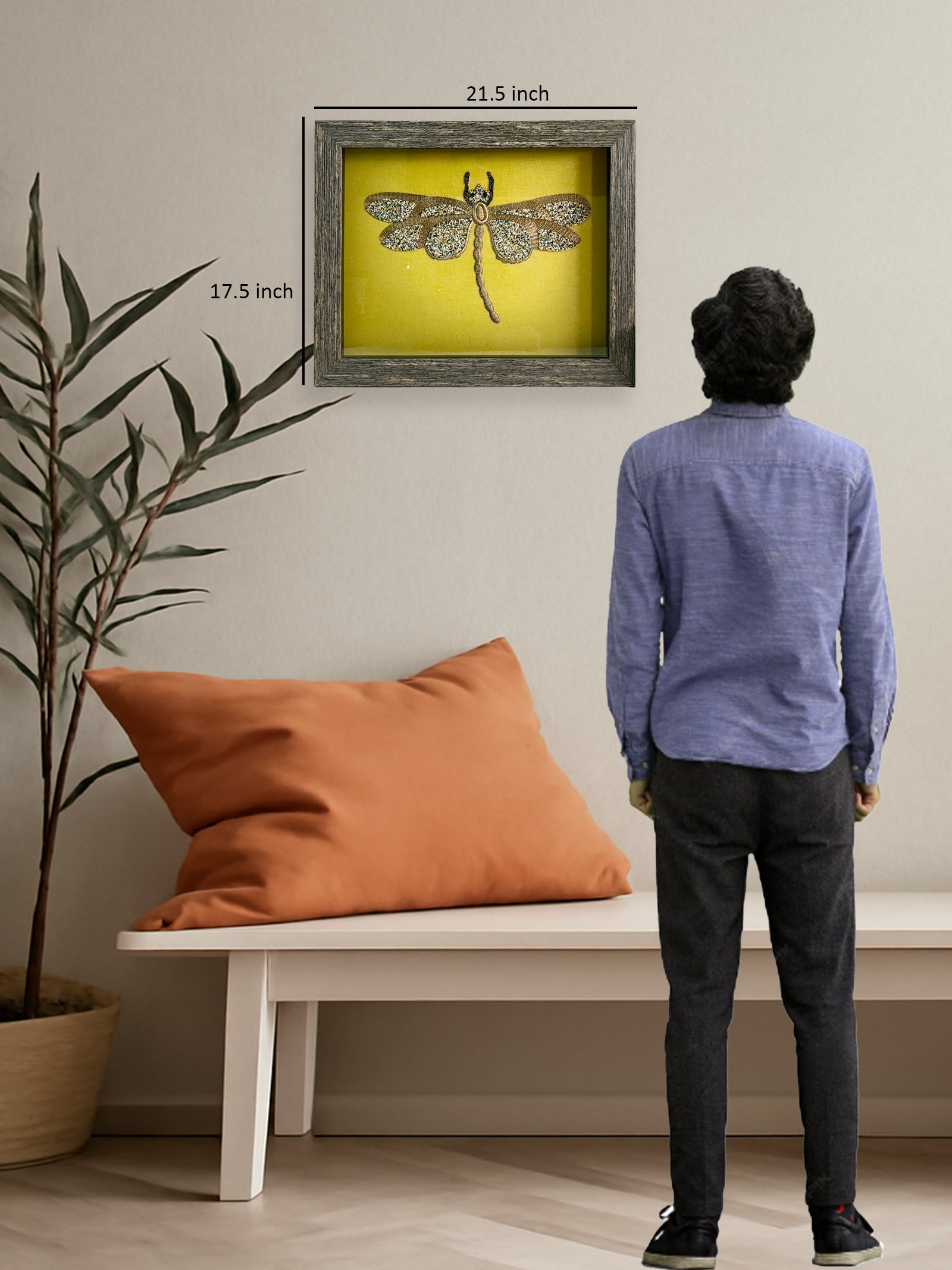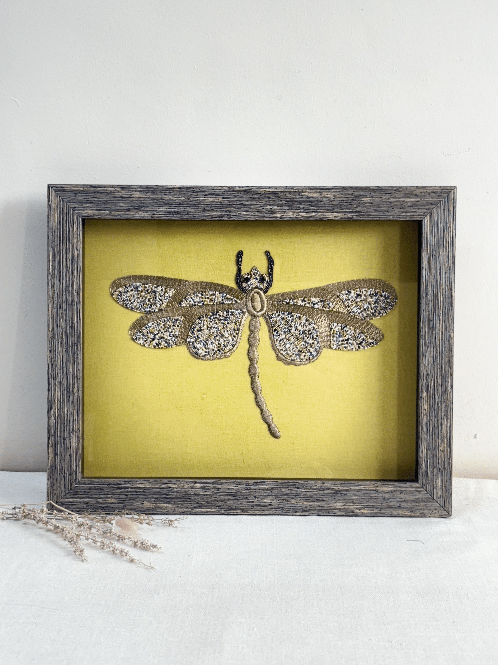 A striking golden dragonfly, intricately hand-beaded with shimmering multi-toned beads, takes flight against a vibrant lemon-yellow backdrop. Every bead captures the insect’s delicate form and the wings’ radiant sparkle. This exquisite piece promises to add a captivating touch of nature’s beauty and unique artistry to your home.