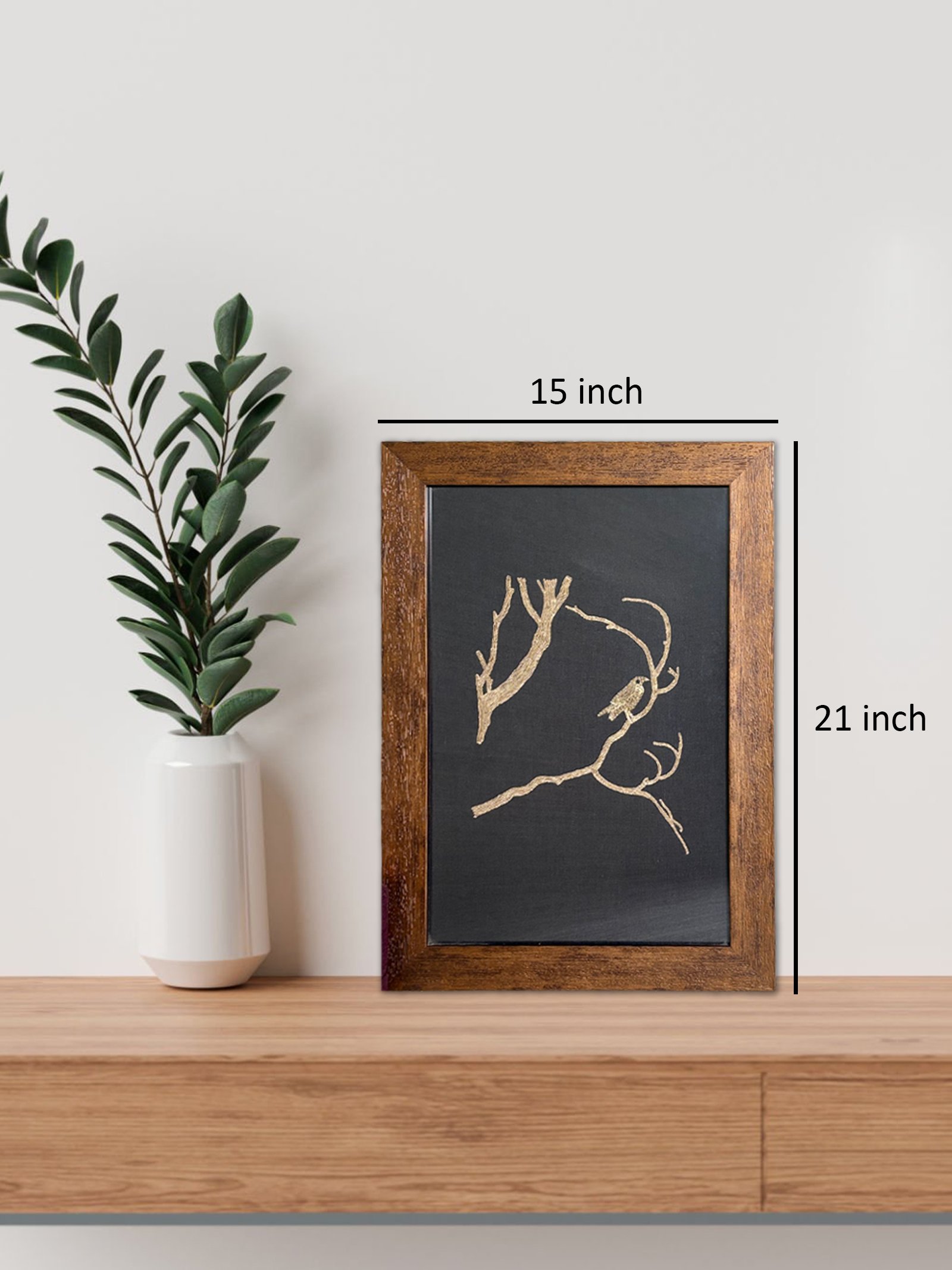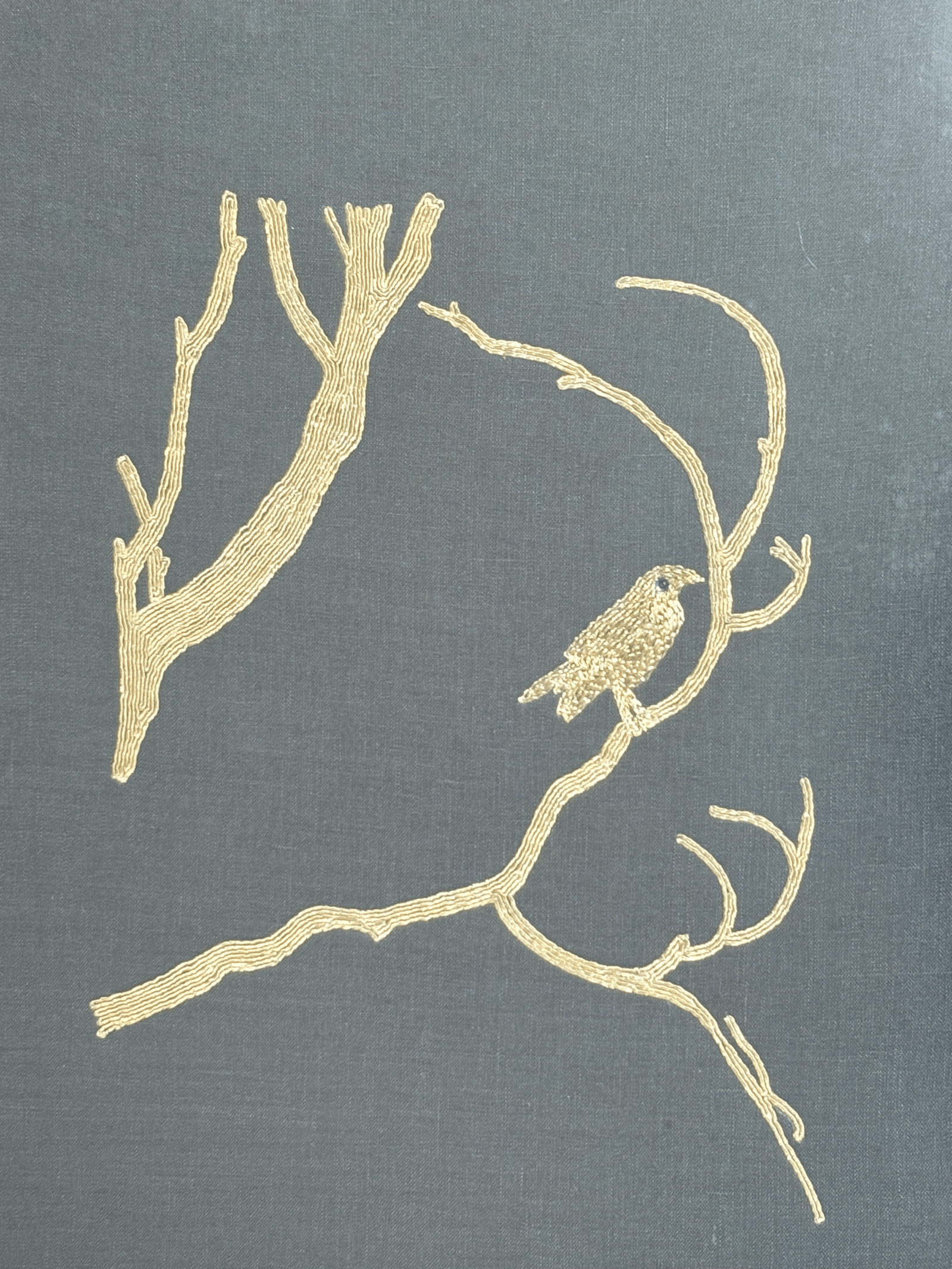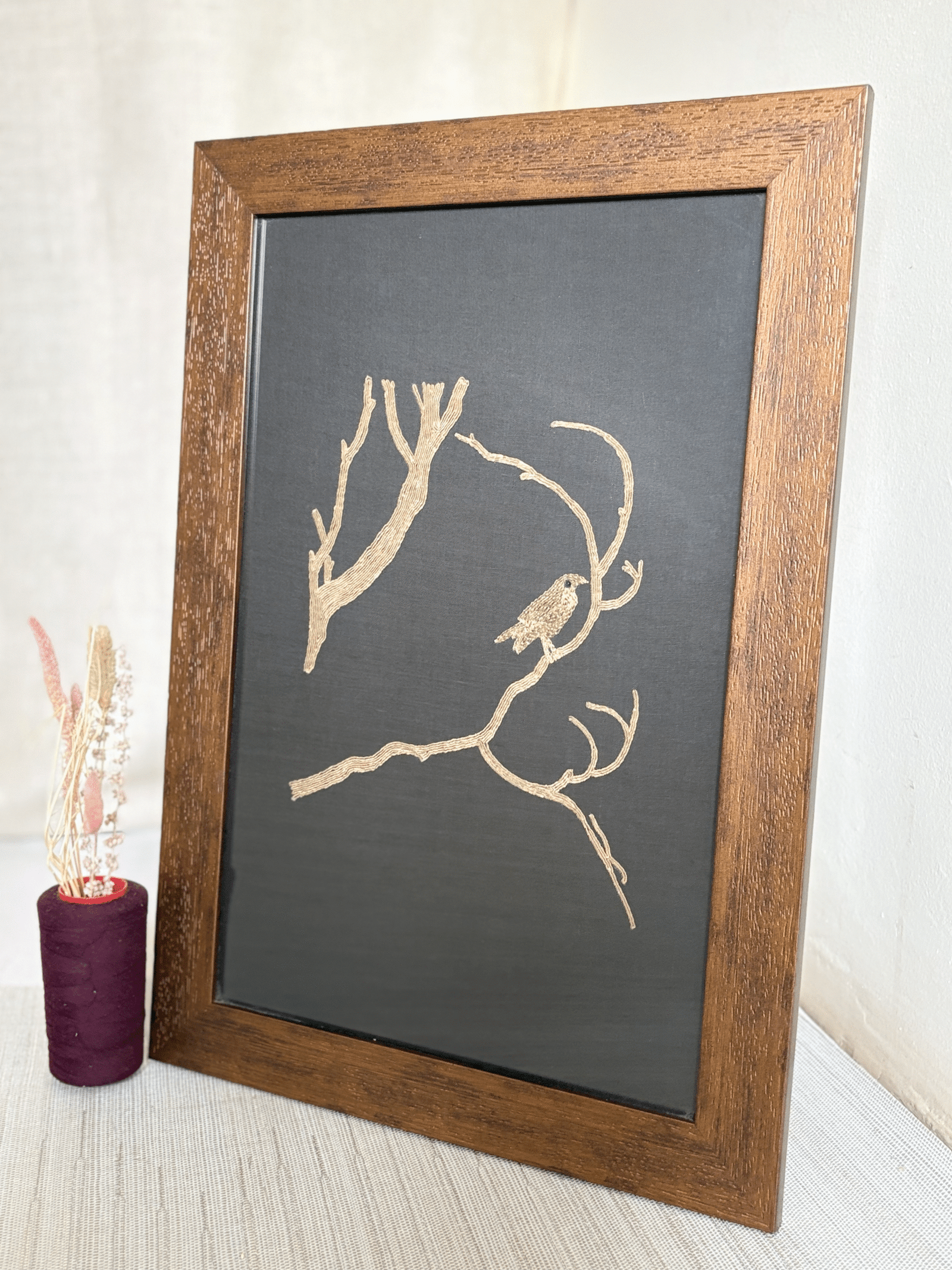 A solitary golden bird, hand-embroidered with shimmering metallic threads, plastic sequins and glass beads, perches thoughtfully on a bare branch against a deep black backdrop. Every stitch captures the bird’s quiet contemplation and the branch’s organic beauty. This serene art piece adds a tranquil, sophisticated touch and natural elegance to any room.