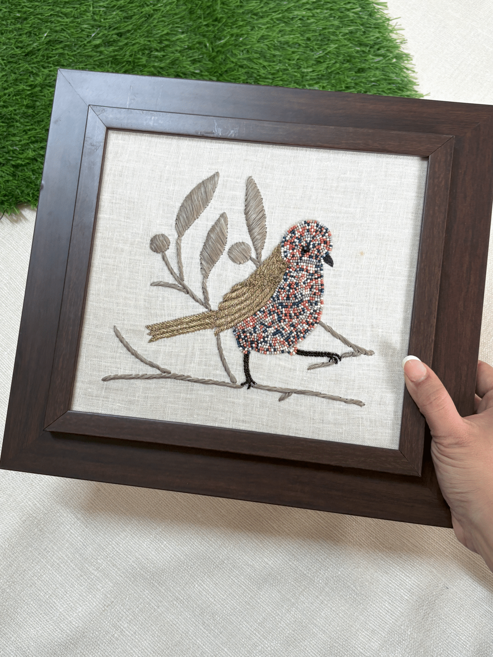 Multicoloured Beaded Sparrow Hand Embroidered Art Frame
