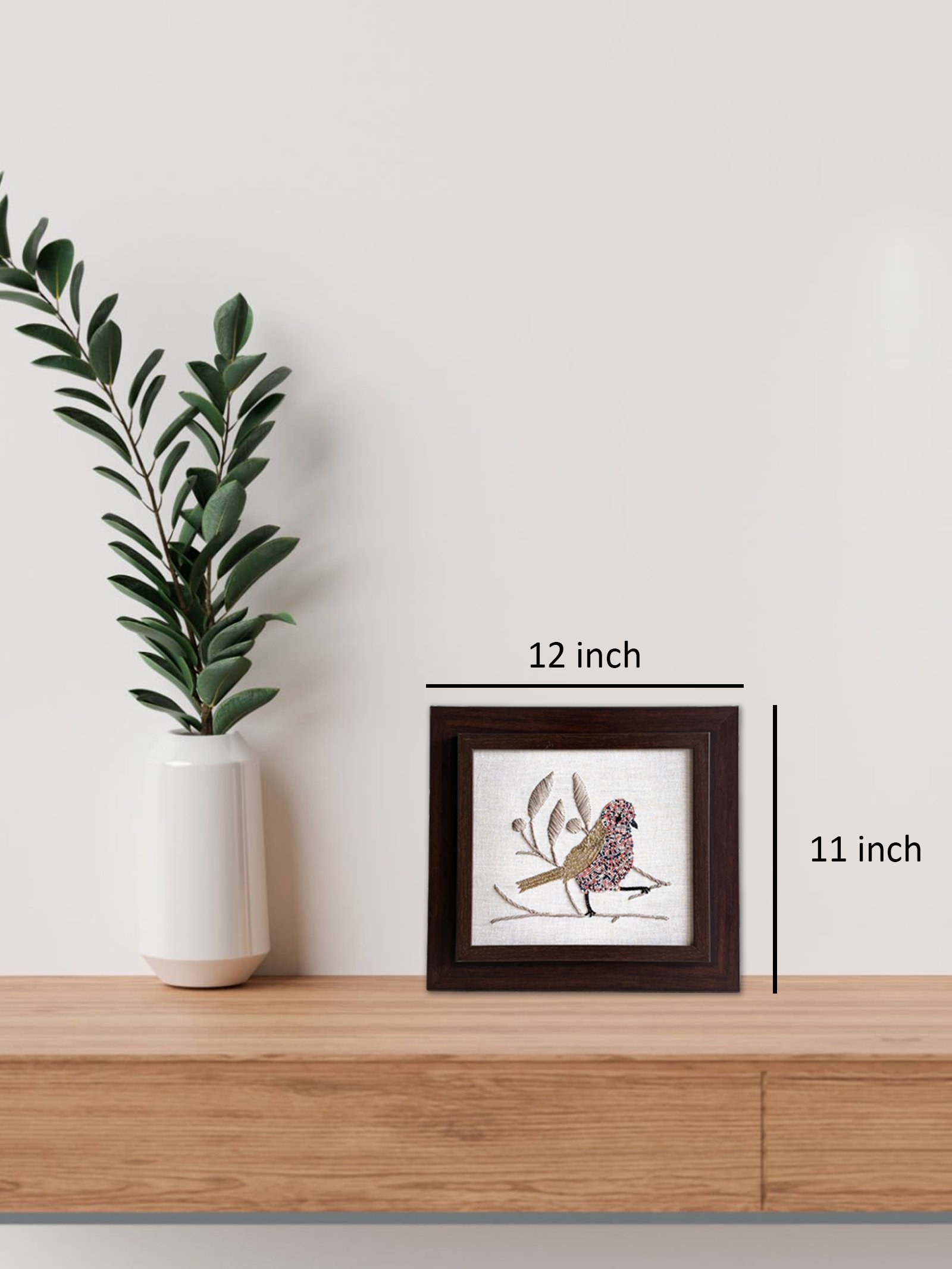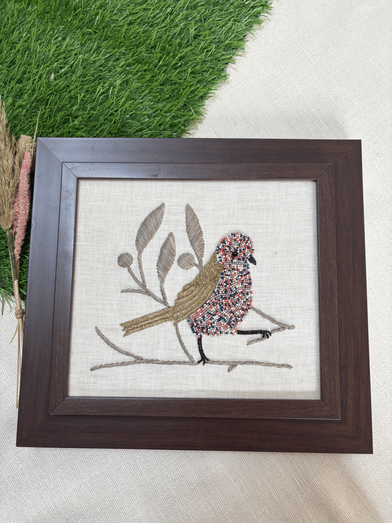 Bring vibrant charm to your space with our “Multicoloured Sparrow” Hand Embroidered Art. Handcrafted using glass beads, raffia and metallic thread, this art piece features a lively sparrow perched on a branch. With its vivid detailing and textured finish, it’s a beautiful blend of colour, craftsmanship, and character – perfect for elevating any room or gifting with meaning.