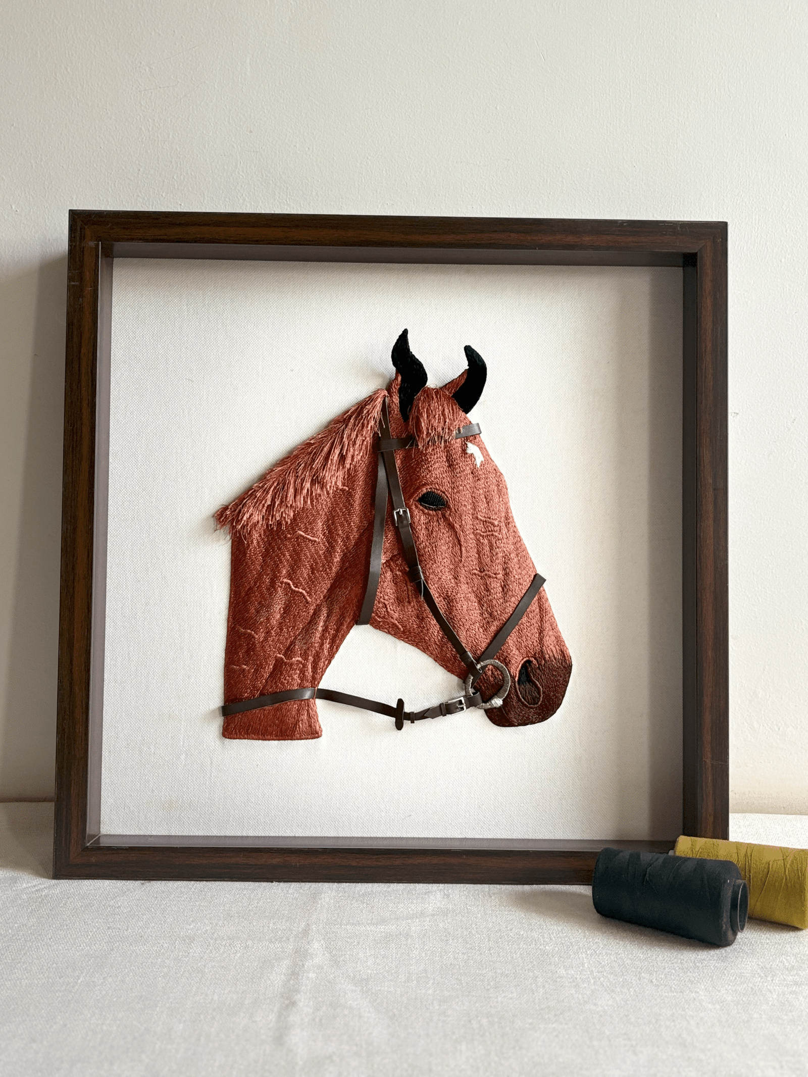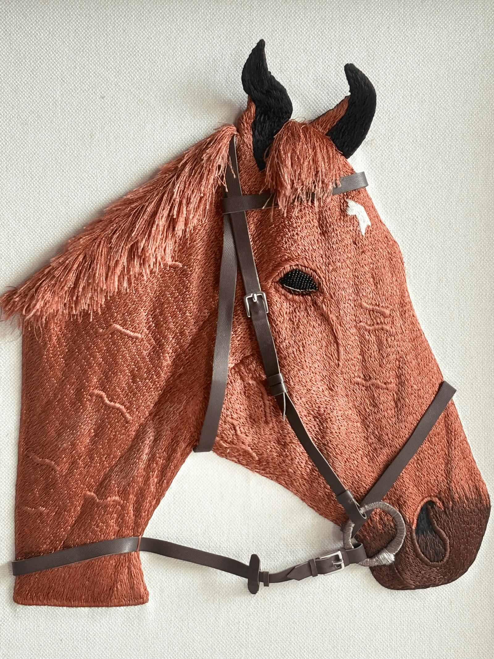 A striking horse head, hand-embroidered with rich, textured brown threads and dark bridle details, stands out against a crisp white background. Every stitch brings out the horse’s strong features and its spirited, rustic charm. This unique handmade art piece is perfect for horse lovers and adds a rugged, charming touch to any space.