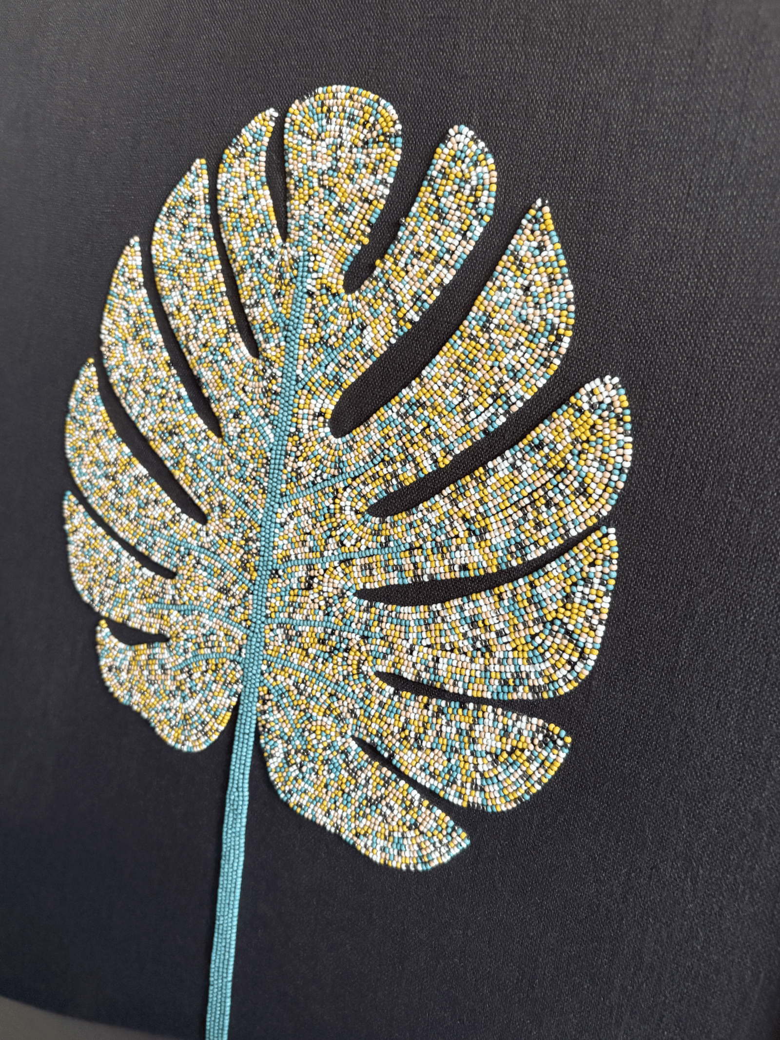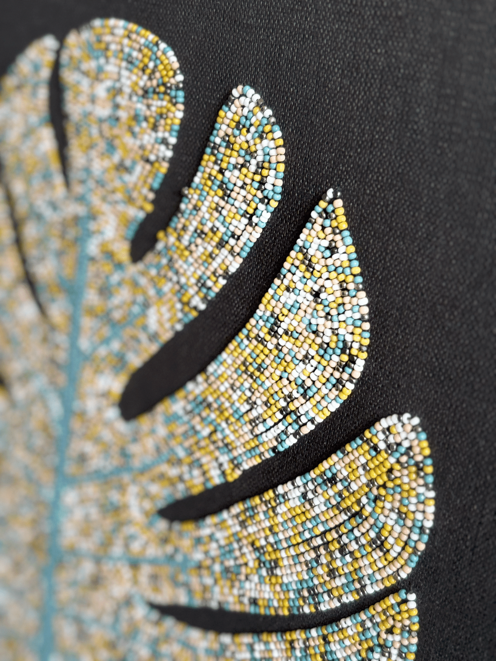 A striking shimmering Monstera leaf, intricately hand-beaded with lustrous multi-toned beads and featuring a distinct teal stem, stands boldly against a deep black backdrop. Every bead captures the leaf’s iconic silhouette and its radiant, textured charm. This exquisite beaded artwork creates a luxurious statement, perfect for a contemporary space seeking sophisticated natural beauty.
