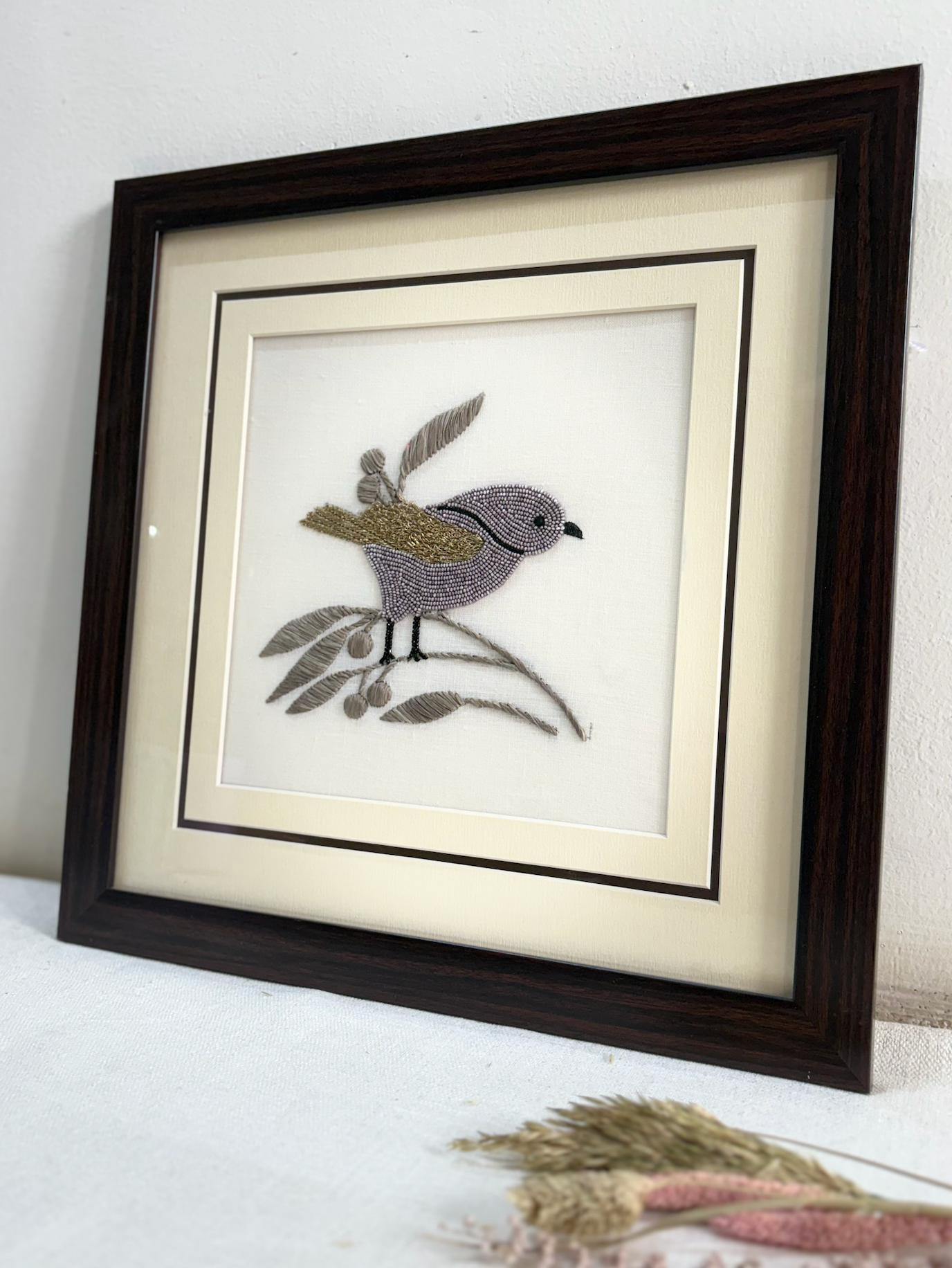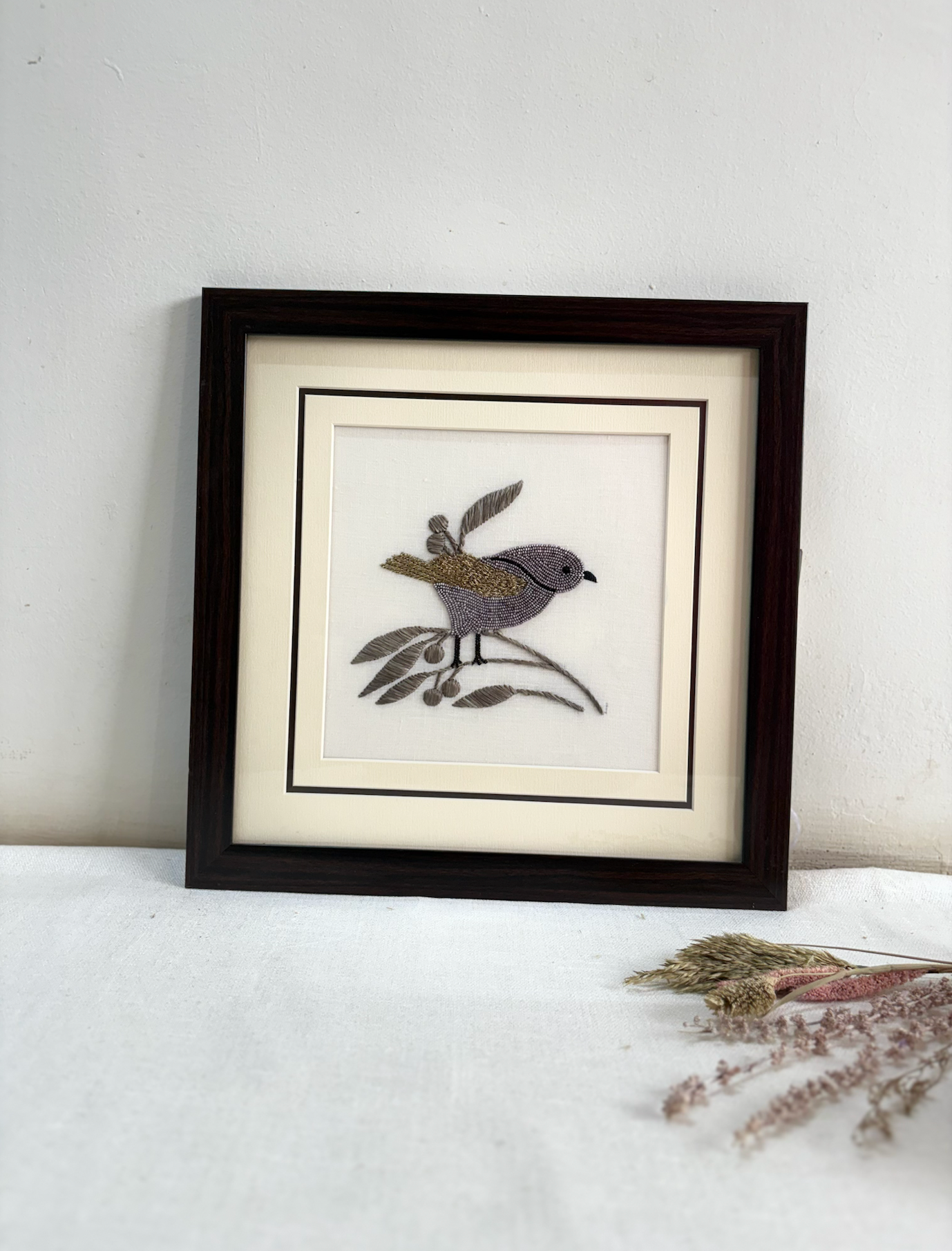 Bring home the charm of nature with our “Sparrow in Stillness” art frame. This hand-embroidered piece features a delicate sparrow made with glass beads, raffia and metallic thread, perched on a stitched branch over a clean white background. A perfect piece of minimalist decor, it adds a calming, handmade touch to any space, or makes a thoughtful gift for someone who loves subtle beauty and artisanal art.