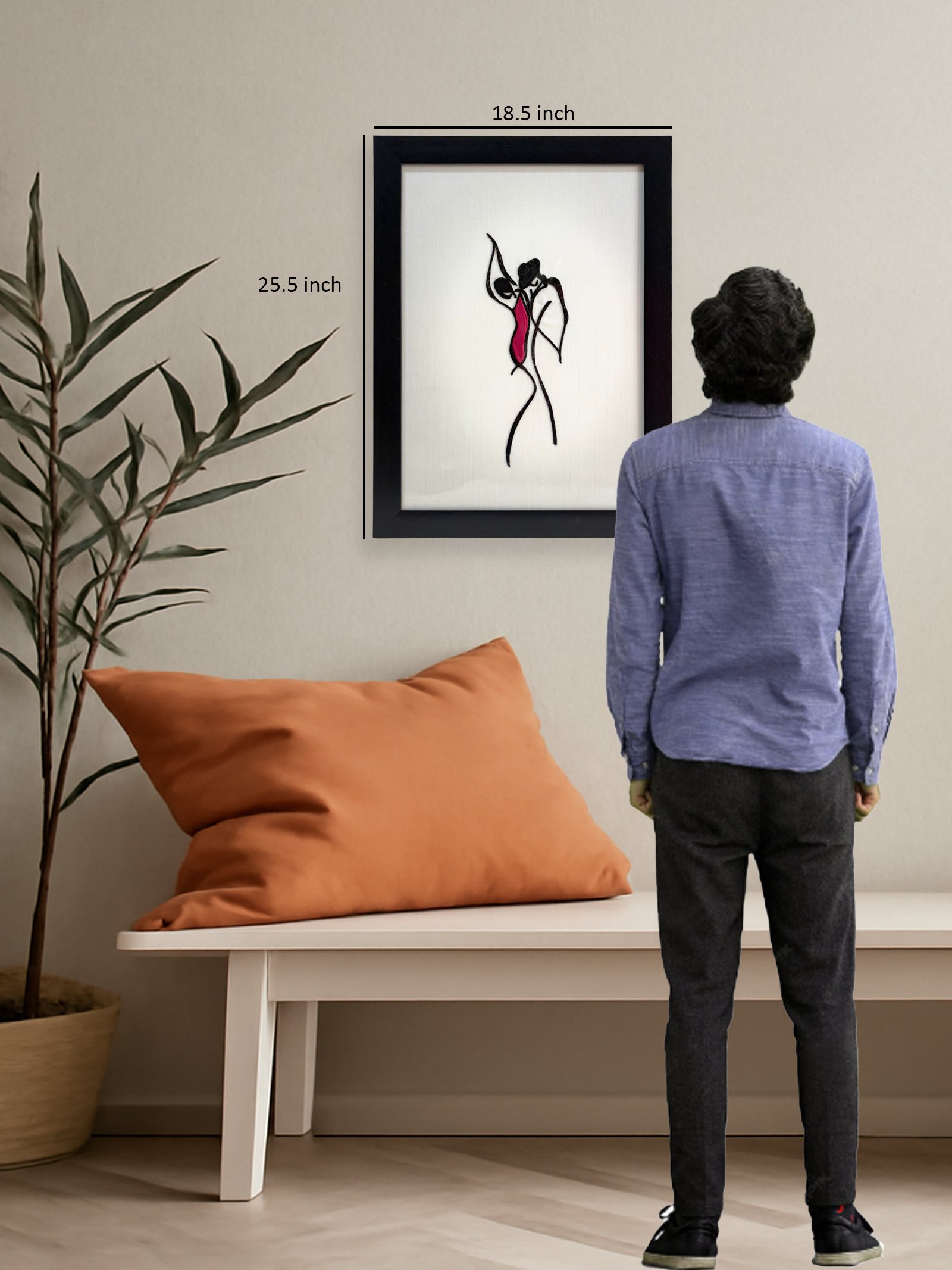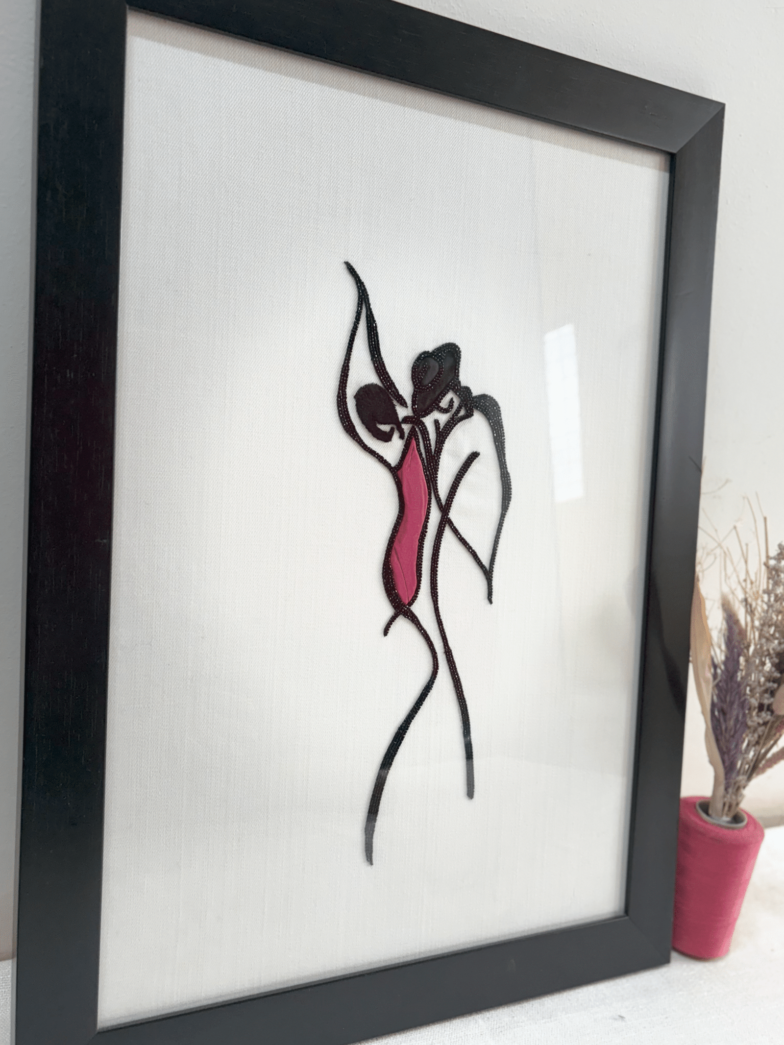 A striking abstract depiction of a tango embrace, hand-embroidered with bold black lines and a vibrant fuchsia accent, stands dynamically against a crisp white backdrop. Every stitch captures the fluidity of movement and the passionate connection between the figures. This captivating abstract artwork brings a dramatic flair and an air of romantic dynamism to any contemporary space