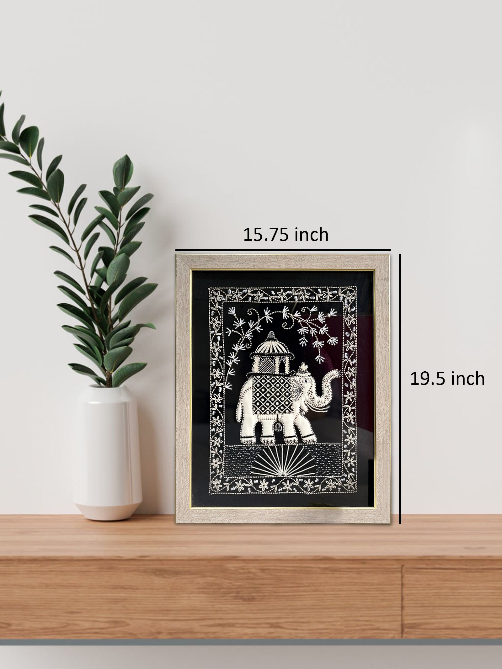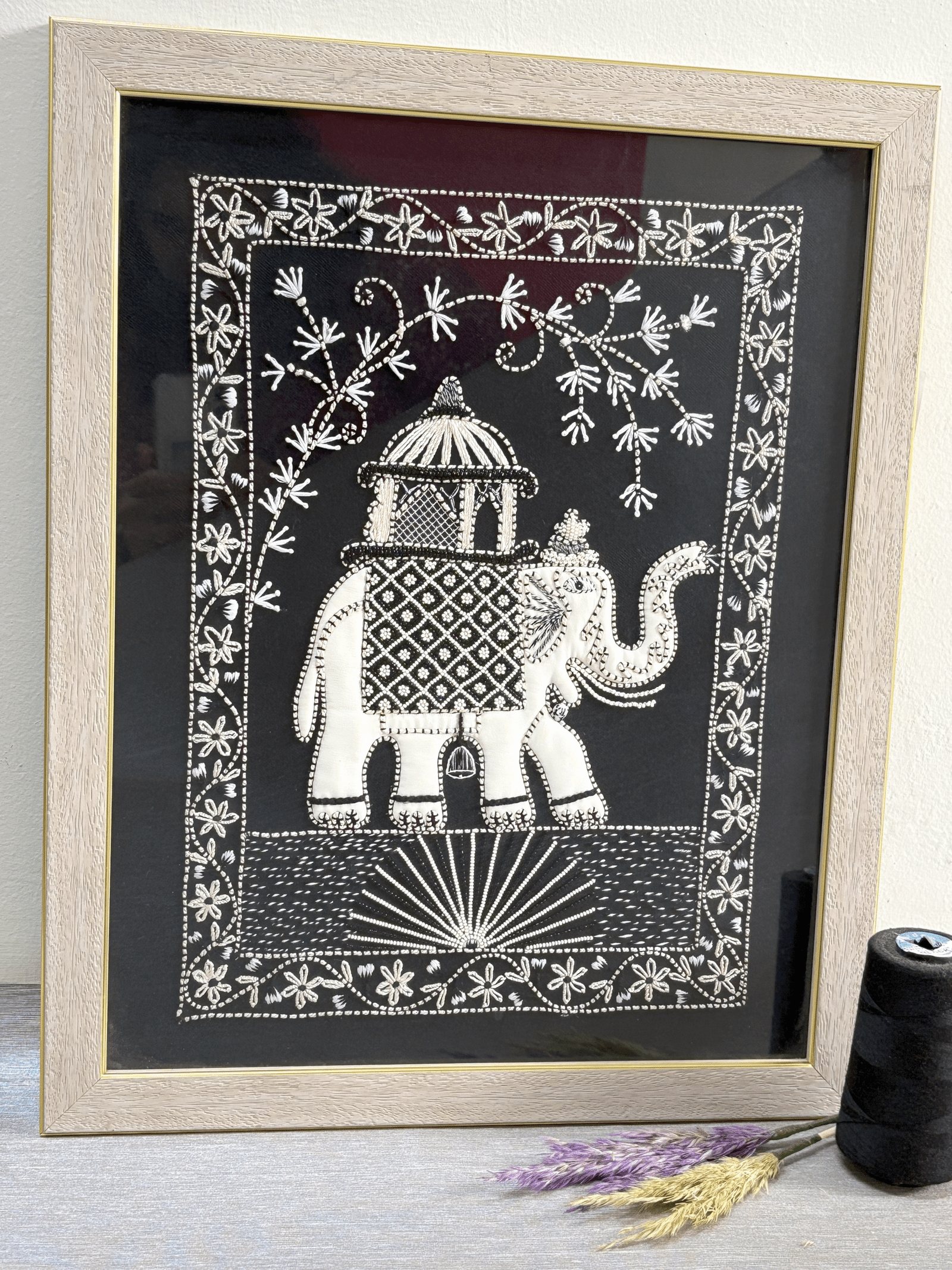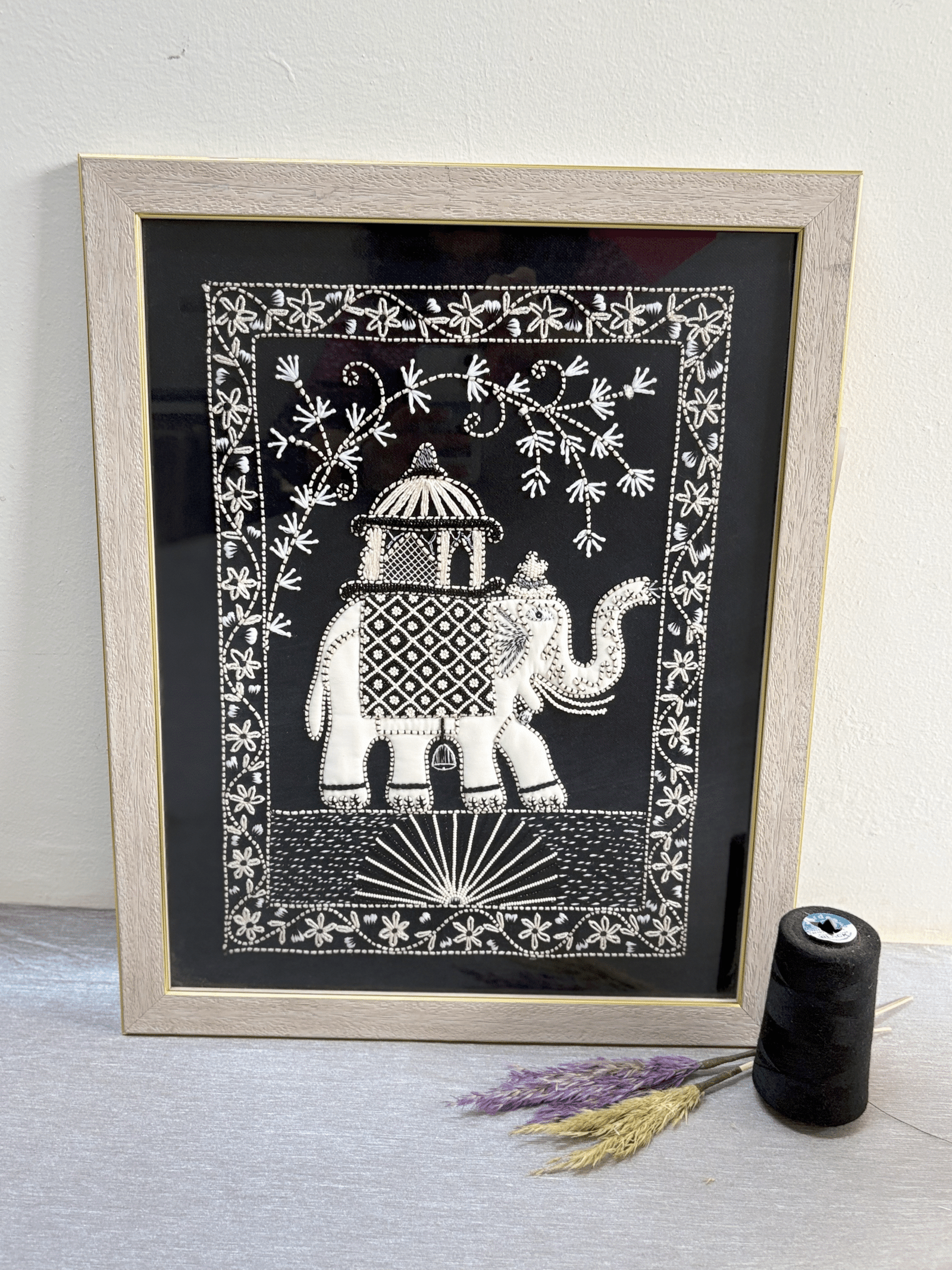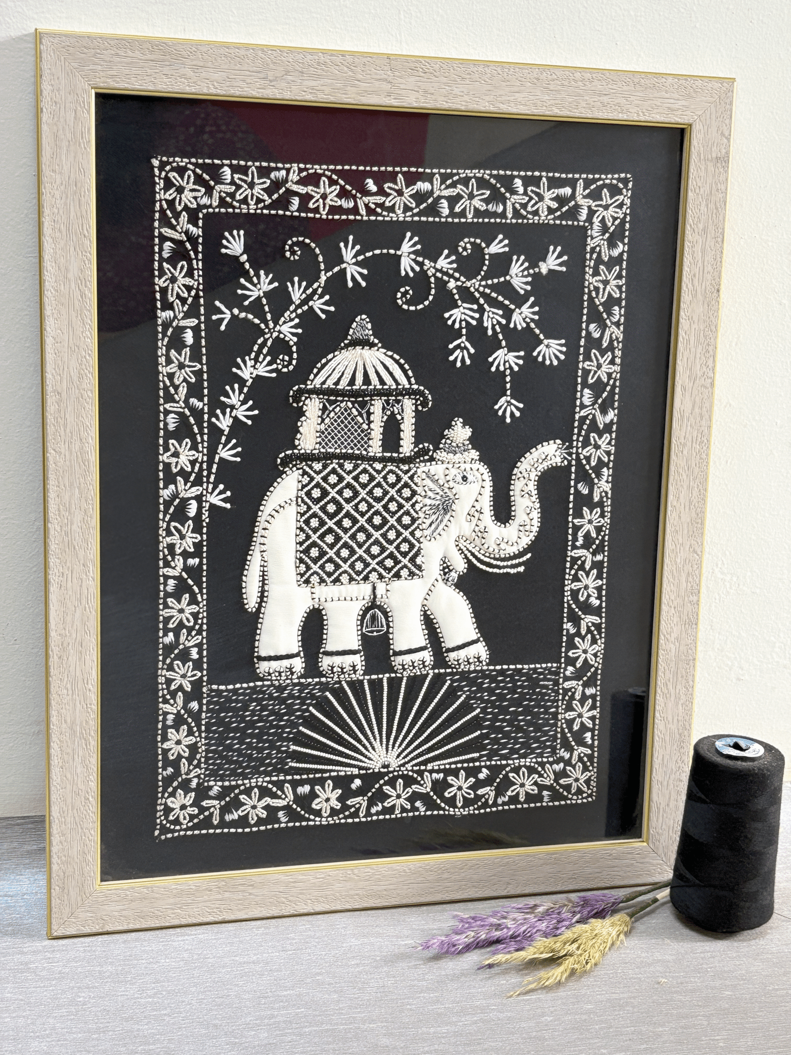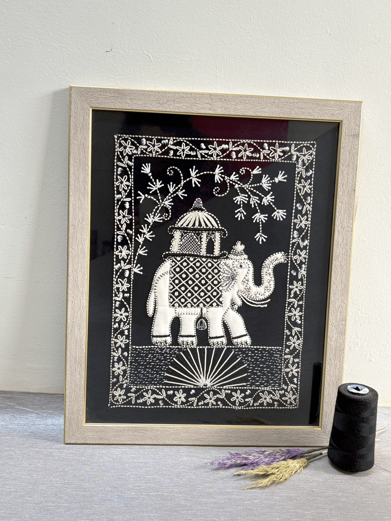 A majestic royal elephant, hand-embroidered with fine white threads and intricate patterns, stands grandly on a dark background with leafy borders. Every stitch shows the elephant’s strength and its detailed, classic beauty. This unique handmade art piece is perfect for adding elegant cultural charm and a timeless look to any home.